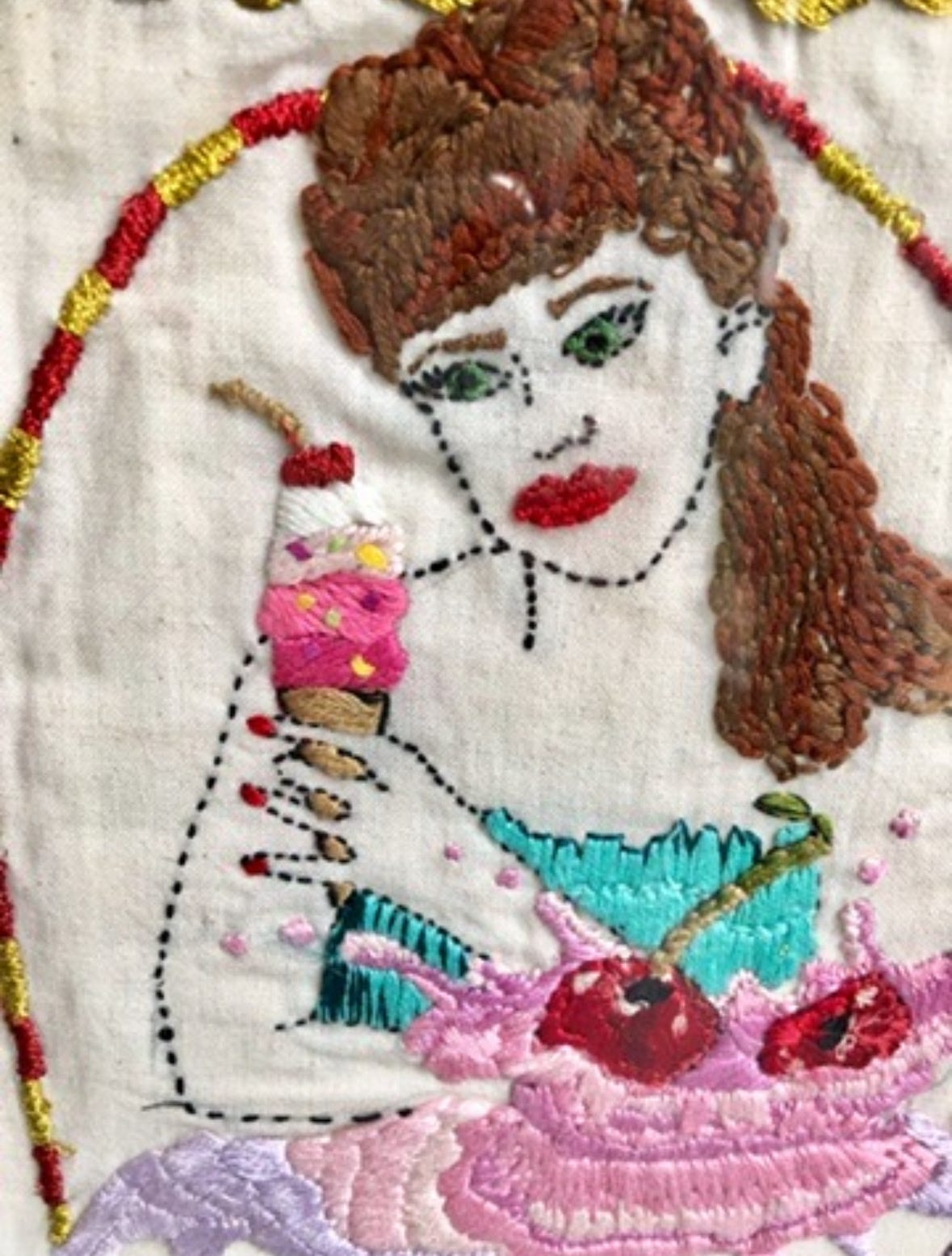 The cherries, milk, hair, ice cream and dress felt successful. I learned how to do satin stitch on the milk and chain stitch on the hair. I had three stitches in the bag now.